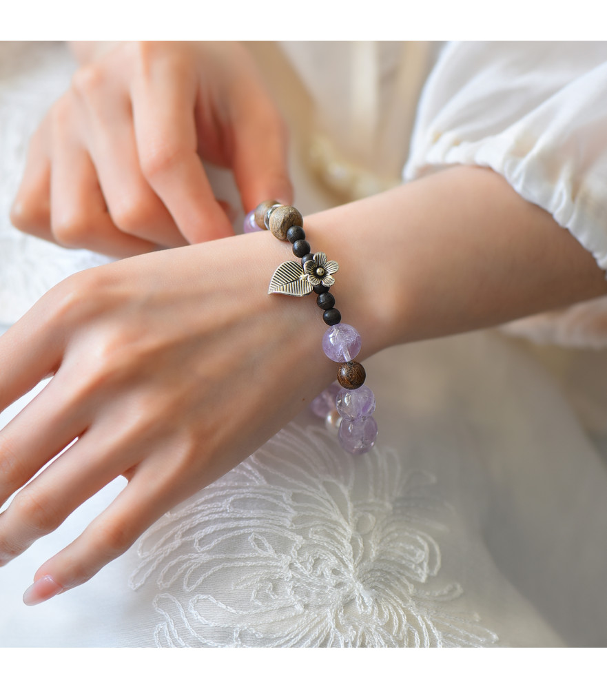 Elevate your everyday style with this elegant handcrafted bead bracelet, designed specifically for women who appreciate natural beauty and unique textures. This piece features high-quality Amethyst stones known for their captivating purple hues, complemented by earthy wood beads and a luminous pearl accent. The delicate floral and leaf charms add a touch of vintage-inspired sophistication, making it a versatile accessory for both casual and formal occasions.