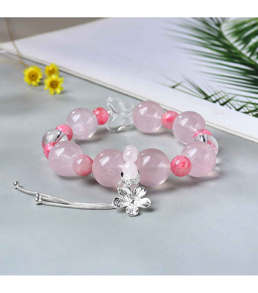 Elevate your everyday style with this elegant handcrafted gemstone bracelet. Featuring a harmonious blend of natural rose quartz, clear quartz, and rhodonite, this piece offers a soft pink palette that complements any outfit. The design is finished with a charming floral pendant and a delicate butterfly accent, making it a perfect accessory for personal wear or a thoughtful gift for someone special.