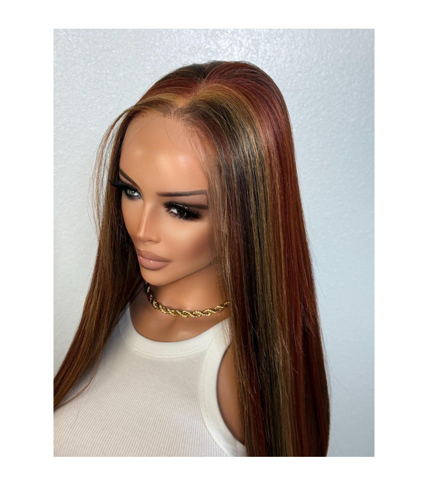 Dark Brown Chunky Intense Red Lace Front Wig, Cinnamon Honey Bold Highlights Long Sleek Wig, 28 13x6 Wide Lace Top Lace Front Wig
