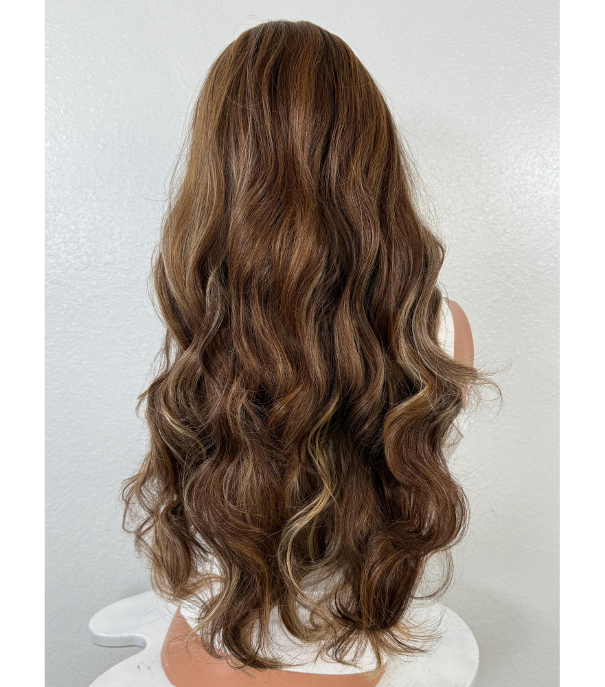 Mocha Brown Spiced Vanilla Blonde Human Hair Blend Wig, Balayage Loose Curls Premium HD