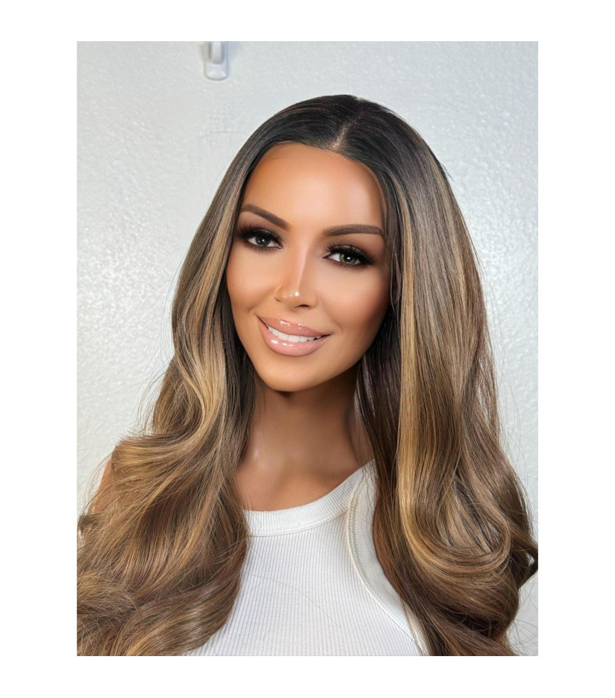 Tags: Brown Blonde Human Hair Blend Wig, Balayage Multi-Part HD Invisible Lace Top Frontal Wig