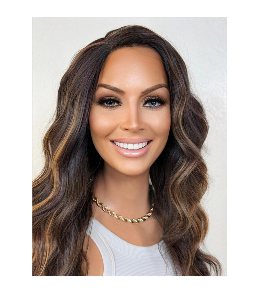Rich Chocolate Brown Wig, Waves Soft Flowing Caramel Ribbon Highlights Wig, Glamour Hairstyle Wig, Premium Swiss Lace Front Wig
