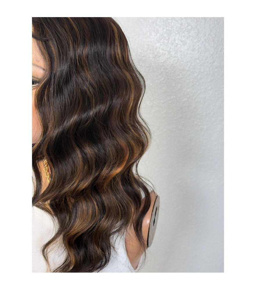 Tags: Rich Chocolate Brown Human Hair Blend Wig, Waves Soft Flowing Caramel Ribbon Highlights