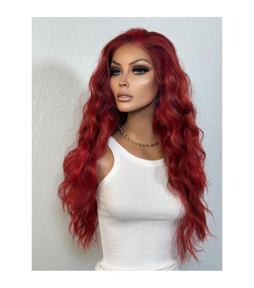 Red Cherry Bombshell Bold Balayage Wavy Long Loose Curls Lace Front Wig, Red Crimson Ombr Lace Front 13x6 Free Part Wig