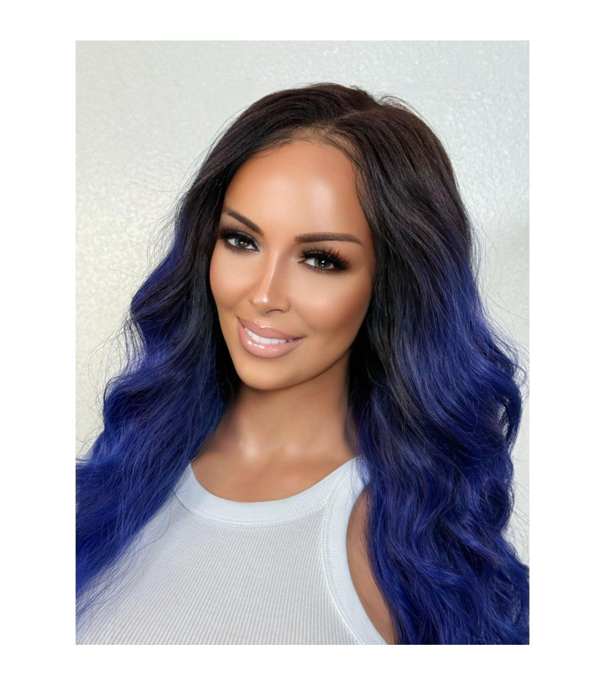 Tags: Royal Galaxy Blue Dark Ombr Roots Top Lace Wig, Swiss Lace Front Free Part Wig, Blue