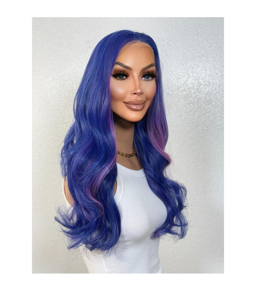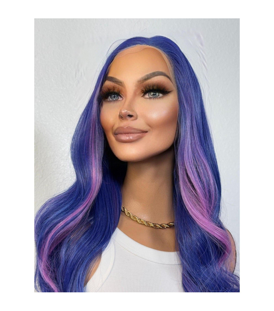 Royal Purple Blue Wig, Lavender PeekABoo Balayage Wig, Face Framing Layers Lace Front