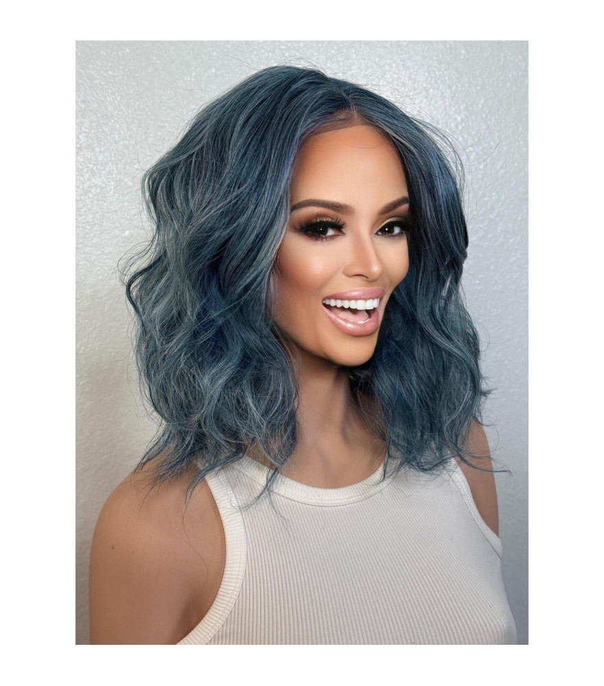 Emperor Blue Short Wavy Lace Front Wig, 12 Multi-Dimensional Lowlight Winter White Mixed