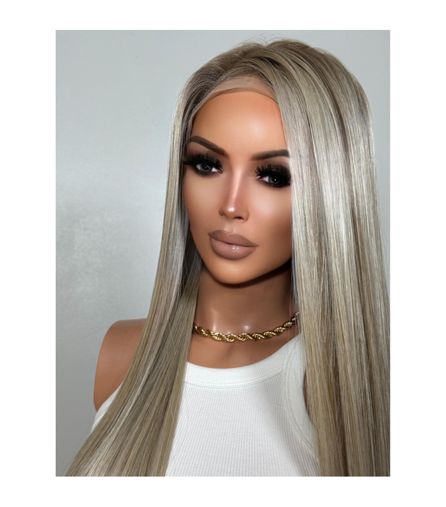 Frosted Ashy Blonde Human Hair Blend Dimensional Balayage 13x6 Free Part Lace Front Wig