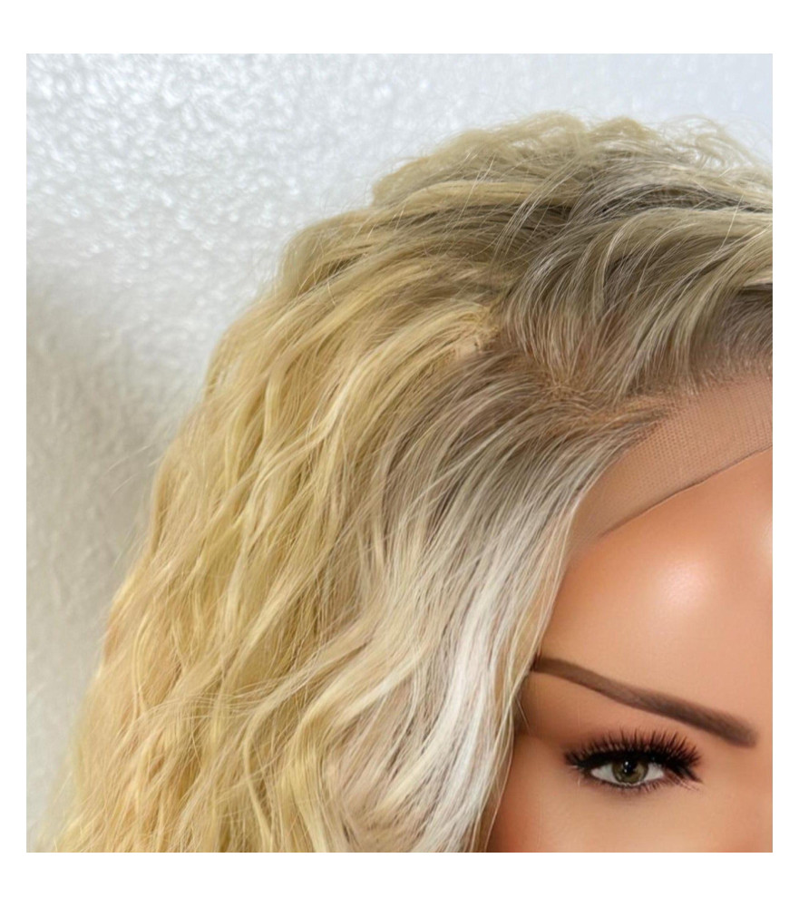 Swedish Blonde Human Hair Blend Lace Frontal Wig, Ombre Roots, HD Invisible Lace Front