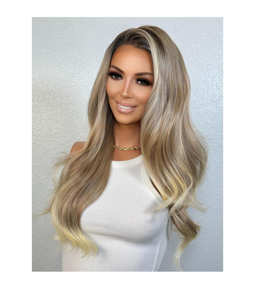 Long Layered Bronde Old Money Hair Lace Front Wig, Balayage Blonde Wavy Wig, 13x4 Free Part HD Invisible Lace Wig