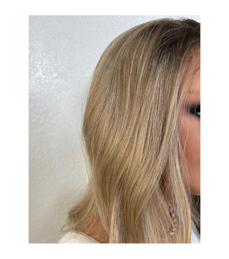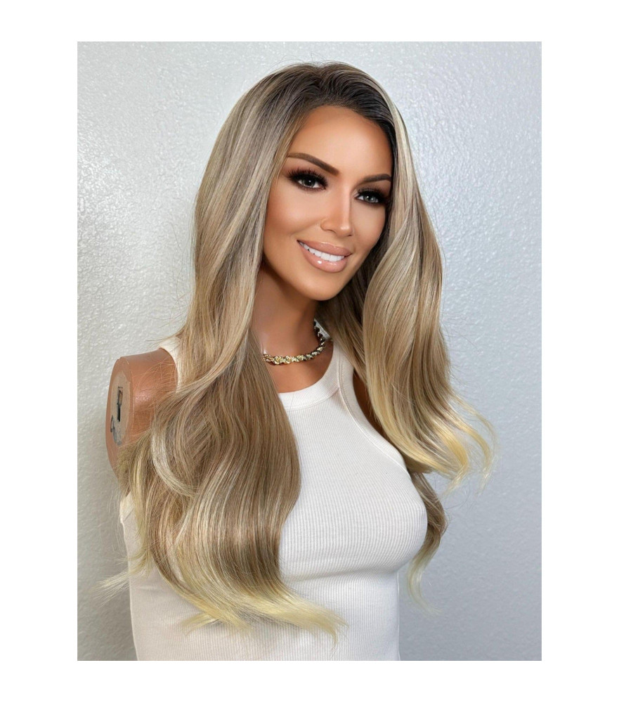 Tags: Long Layered Bronde Old Money Hair Human Hair Blend Lace Front Wig, Balayage Blonde Wavy
