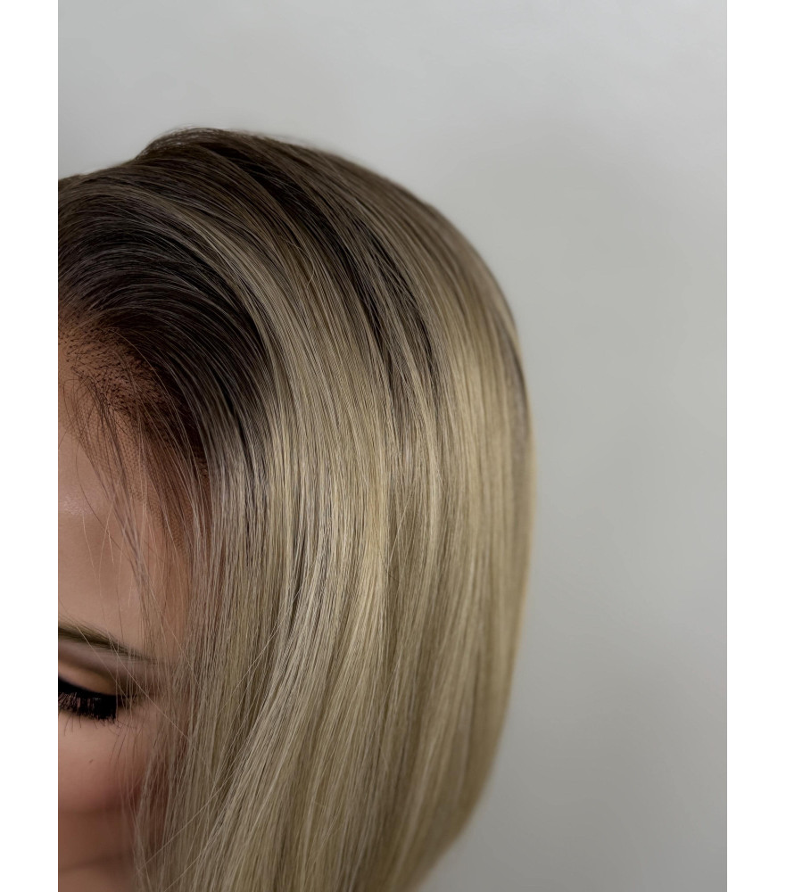 Ashy Blonde Dark Brown Roots Layered Wavy Human Hair Blend Wig, Pre-Plucked 13x4 Free