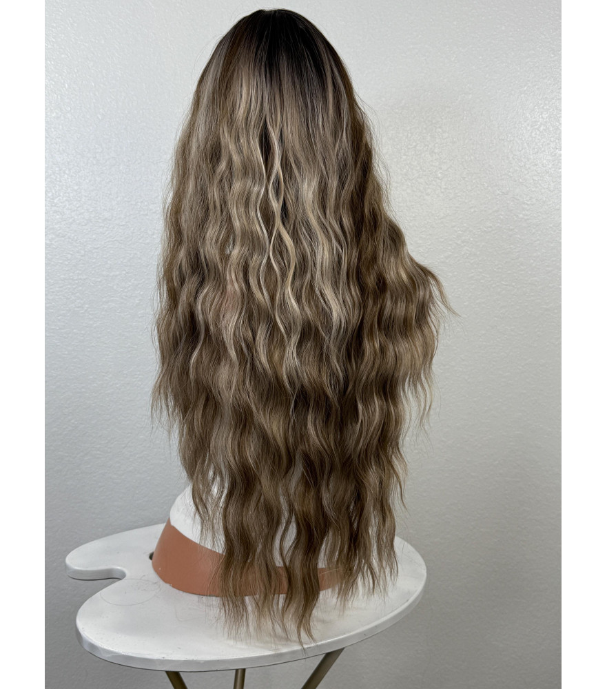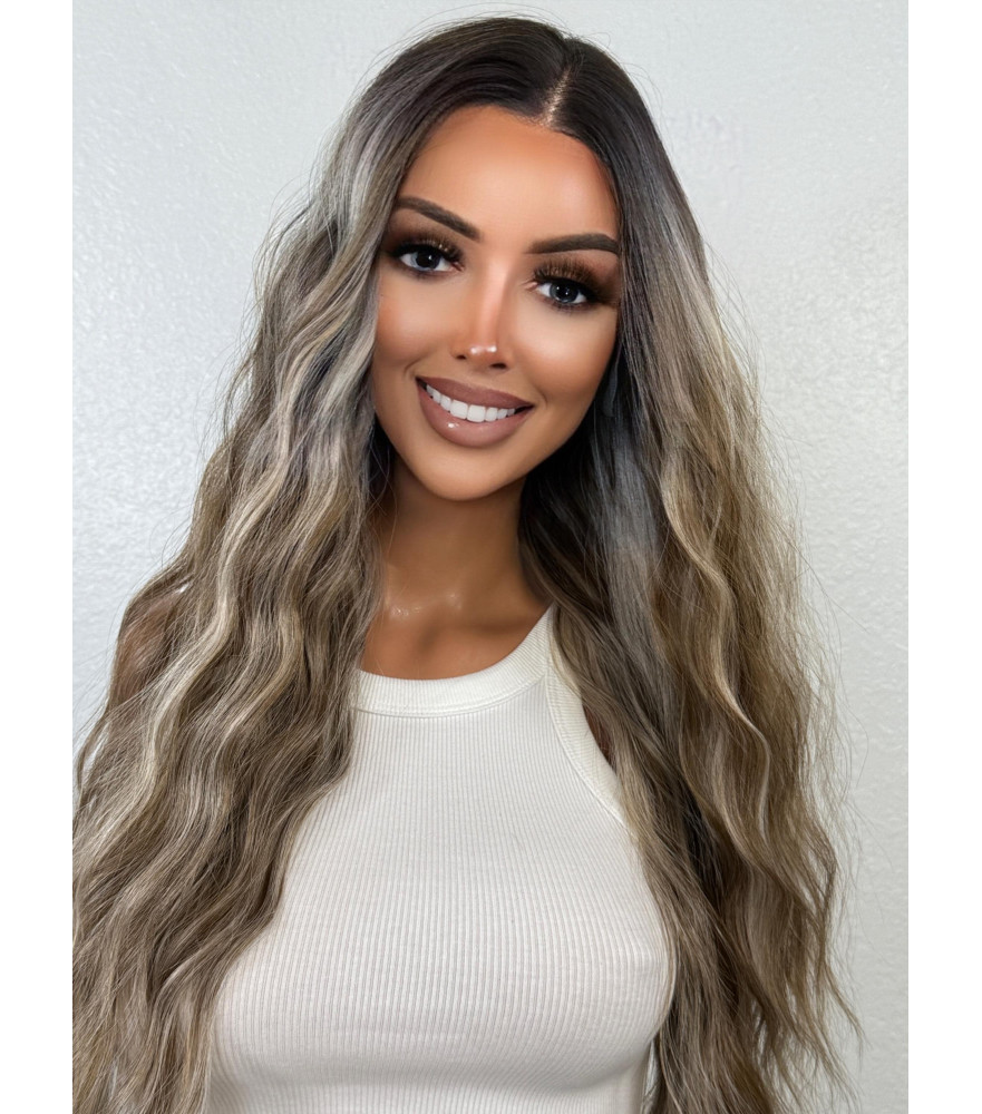 Rooty Ash Blonde Lace Front Wig, Bold Face-Framing Highlights, 28 inch Layered Wavy Frosted Blonde Hair Balayage Wig