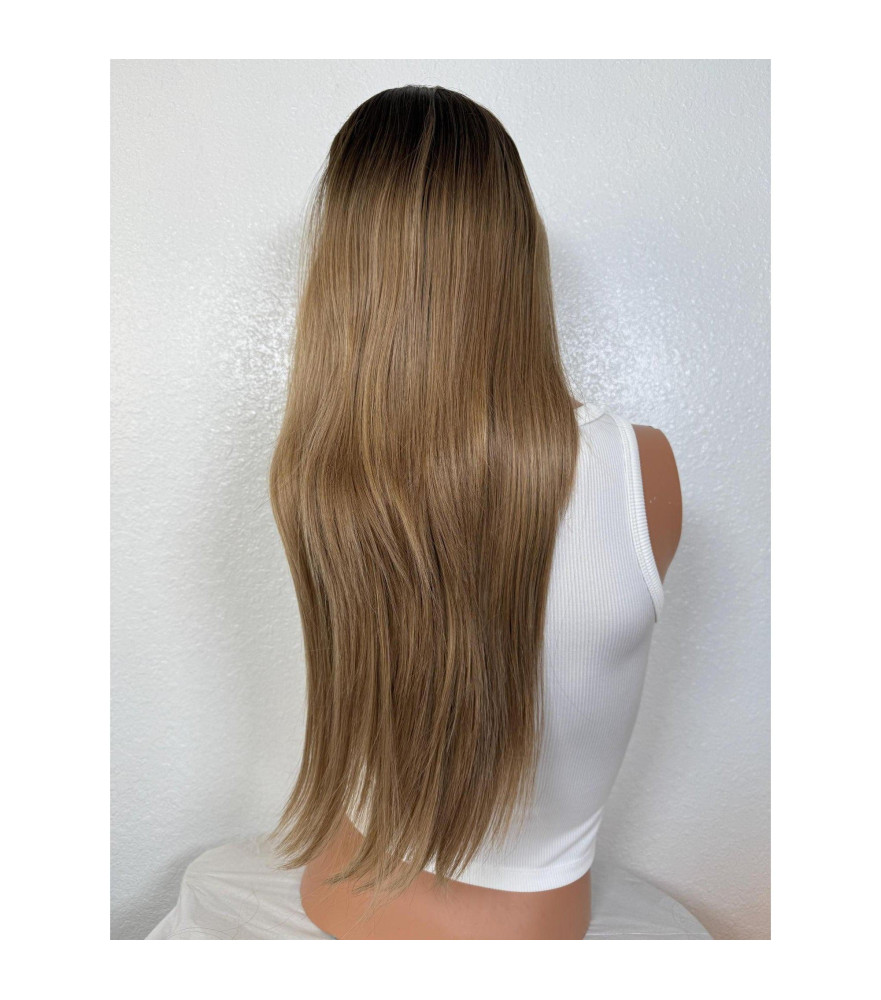 Wavy Dark Blonde Human Hair Blend Wig, Long Straight Wig, Root Melting Bangs No Lace Wig