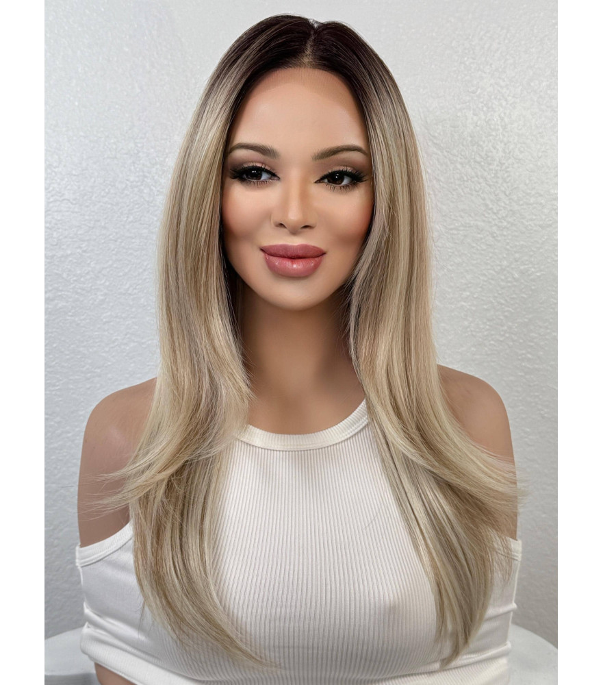 Blonde Dark Roots Lace Frontal Wig, Ombr 18 inch Face Framing Layered Straight 13x6 Free Part Heat Friendly Wig For Women