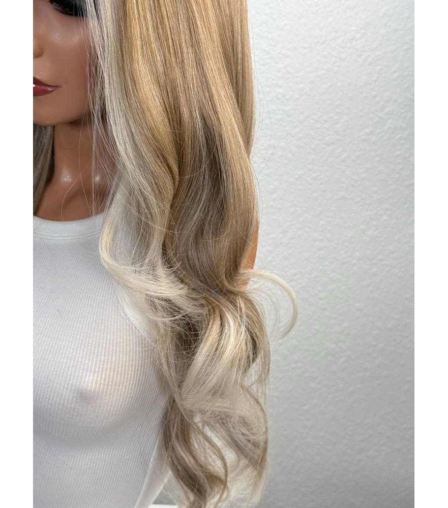 Tags: Platinum Blonde Human Hair Blend Wig, Money Piece Sand Blonde Hair Wig, Balayage Wavy
