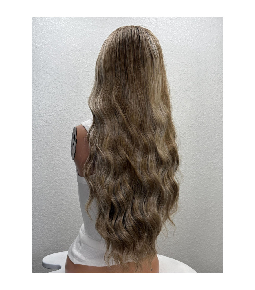 Hair Color: Light Brown Rooted blended with hints of Strawberry Light Golden Blonde, Cool Light Blonde Highlights.