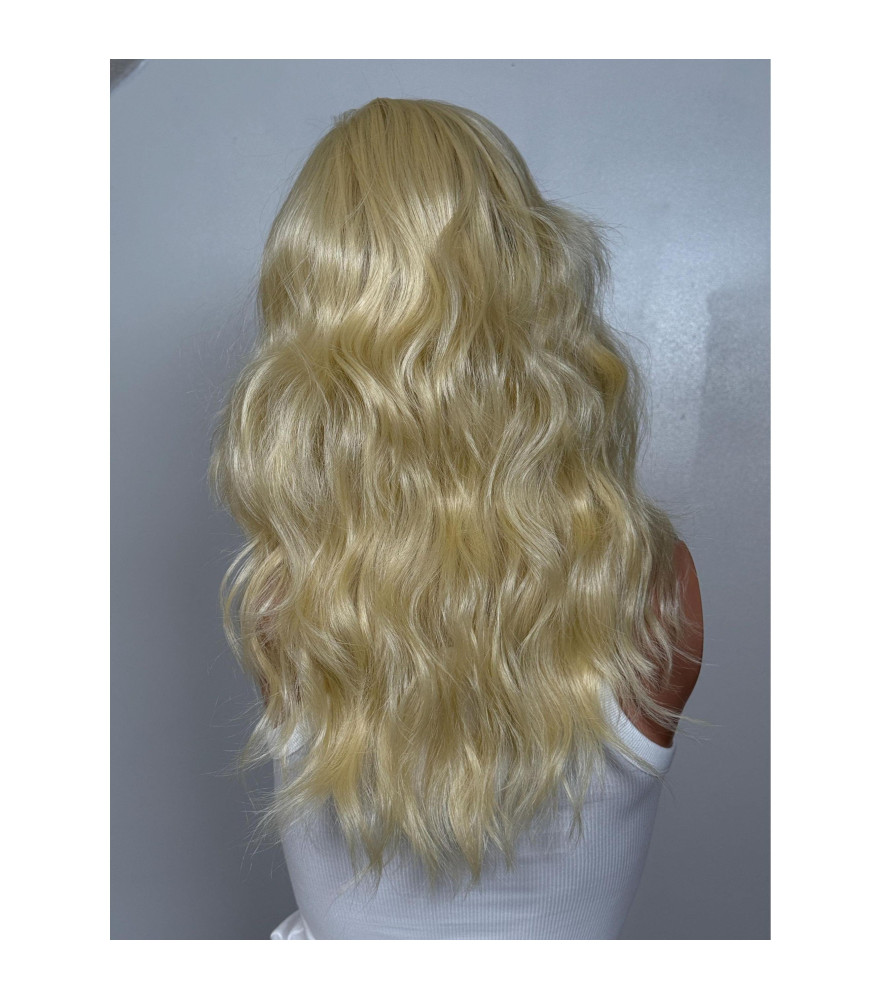 Lightest Swedish Blonde Human Hair Blend Wig, Anna N. Sexy Pin Up Style Curls Wig, 18
