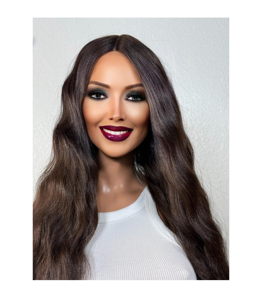 Tags: Dark Chocolate Brunette Brown Human Hair Blend Wig, Soft Dominican Textured Wide Crimp