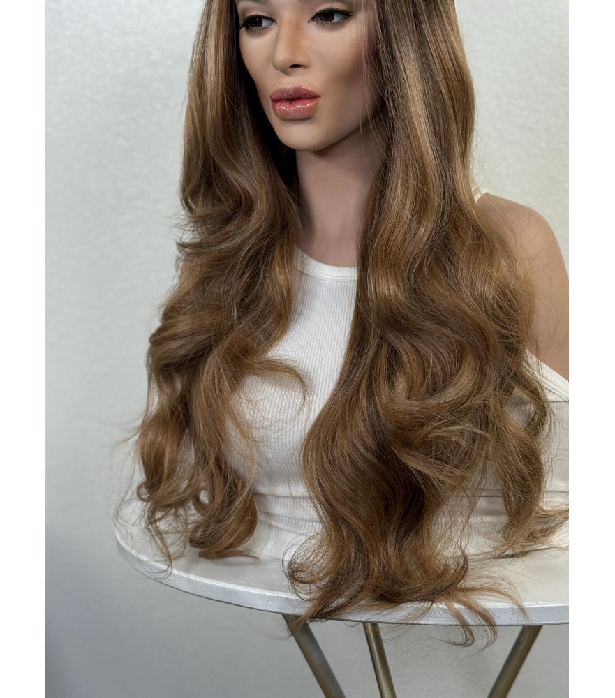 Toffee Brown Human Hair Blend Vanilla Blonde Highlights Layered Loose Curls Wig | HD