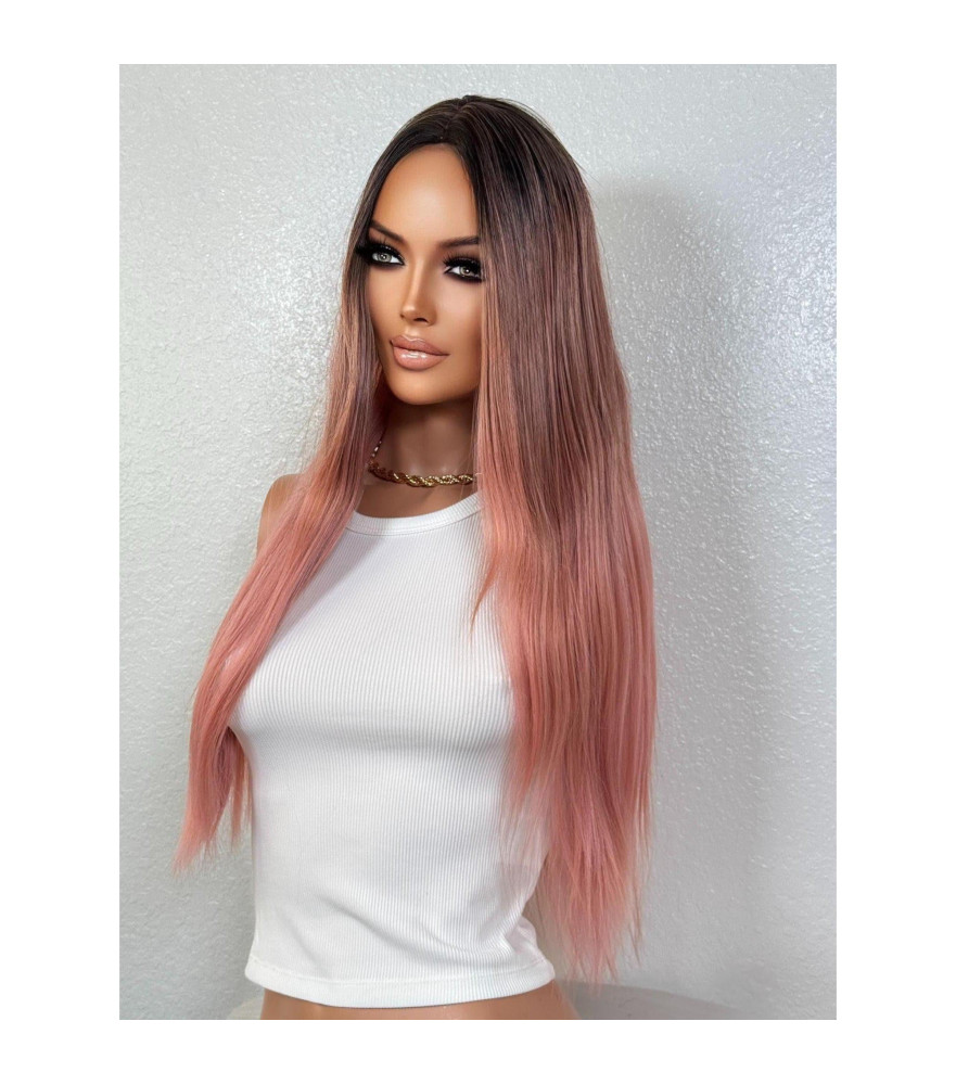 Pink Ombr Long Straight Wig, Heat Safe Hair Wig for Bachelorette, Breast Cancer