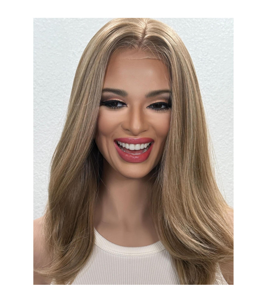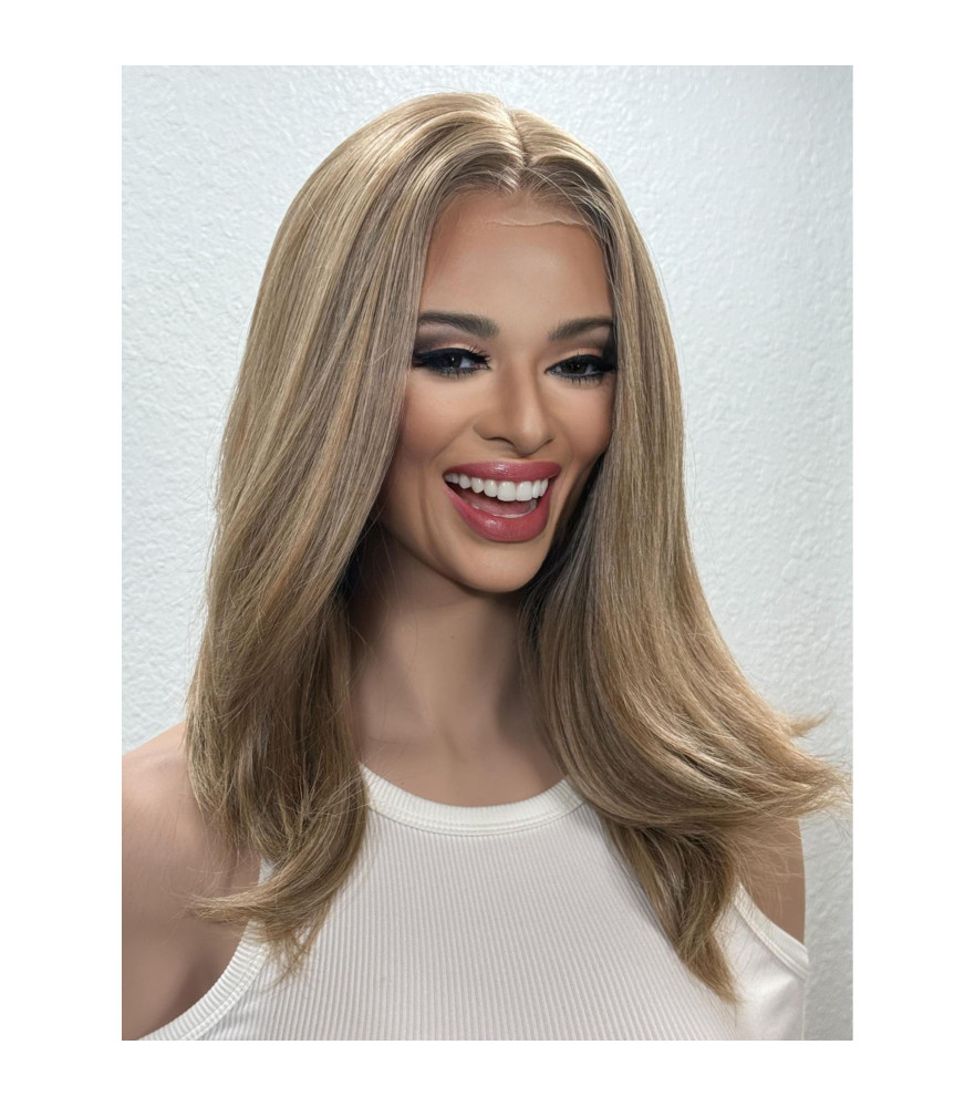 Dark Cool Blonde Level 7 Lace Frontal Human Hair Blend Wig / 14 inch Straight Round Brush