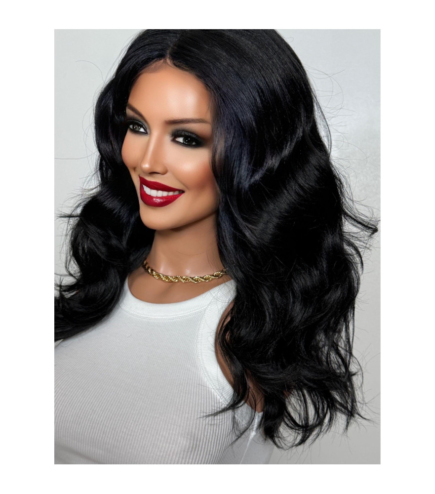 Black Wig, Full Body Round Brush Blow Out-Style Bohemian Dominican Textured Natural Curls 4x4 Multi-Part Lace Front Wig