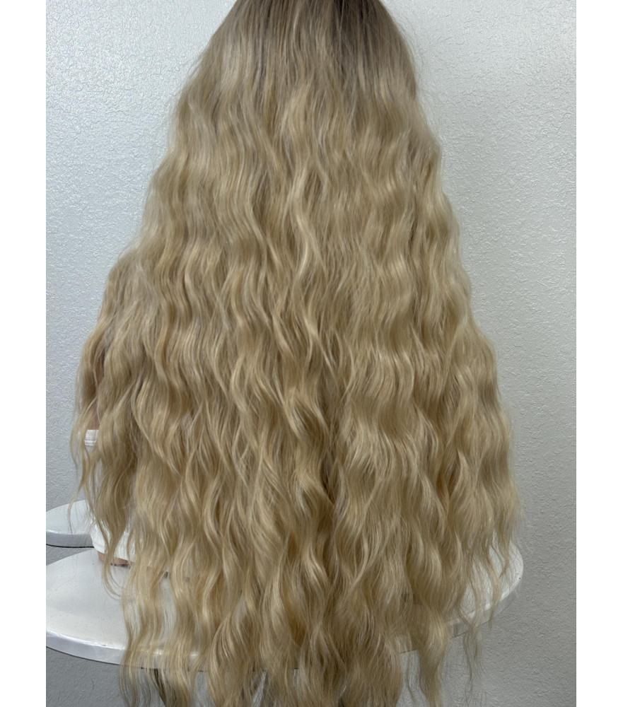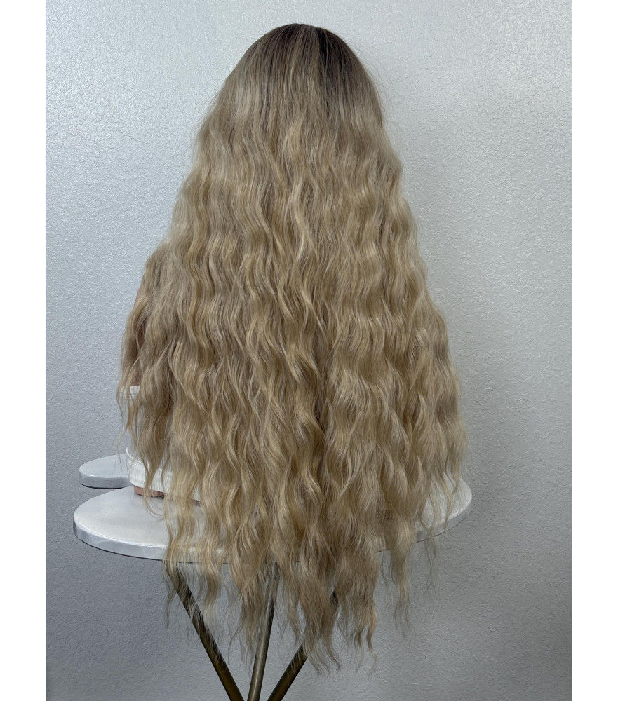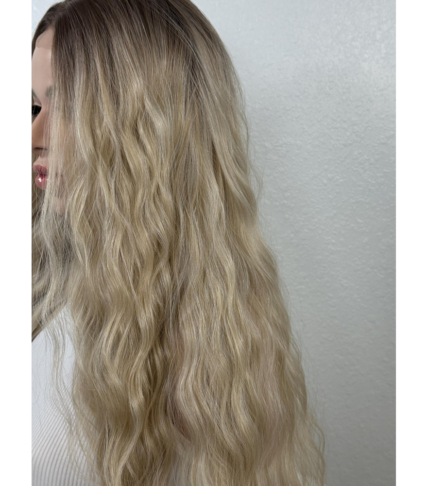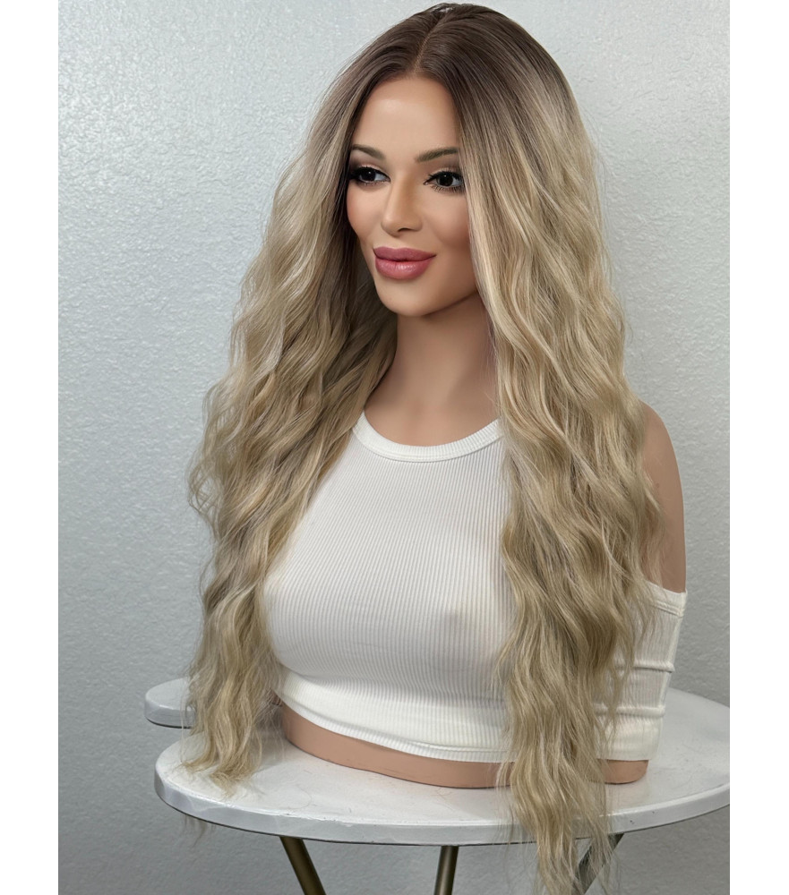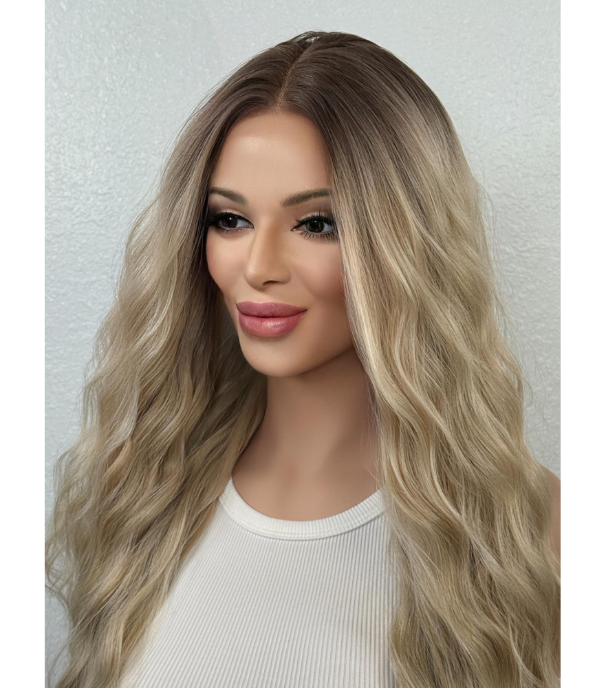 Creamy Mixed Blonde Human Hair Blend Wig, Long Hair Wig With Dark Roots / 26 Inch Mixed
